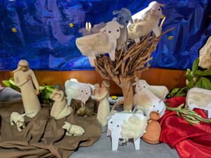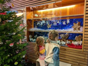 An unserem Weihnachtsbaum gestalten die Religionslehrerinnen eine „Mitmachkrippe“ für die Kinder.